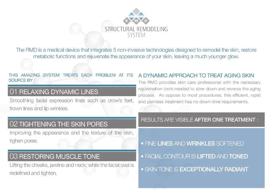 RMD combines 5 in 1 proven technologies. These technologies will help visibly reduce wrinkles and fine lines, firm and reshape the face.